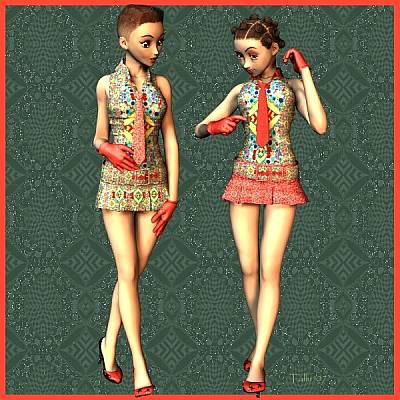 separate MATs, so that they can all be interchanged! All textures, including the bump maps, are hand drawn by Tallulahdahling, so there are no worries about treading on fabric pattern copyrights. These textures are cheery and perfect for holiday renders, but they also will work well (except perhaps the screamingly red and green blouse) at any other time of year. You may object that "Cool Fever" is a little *too* cool to be worn in a winter wonderland, but I live in Australia. So there! Besides,