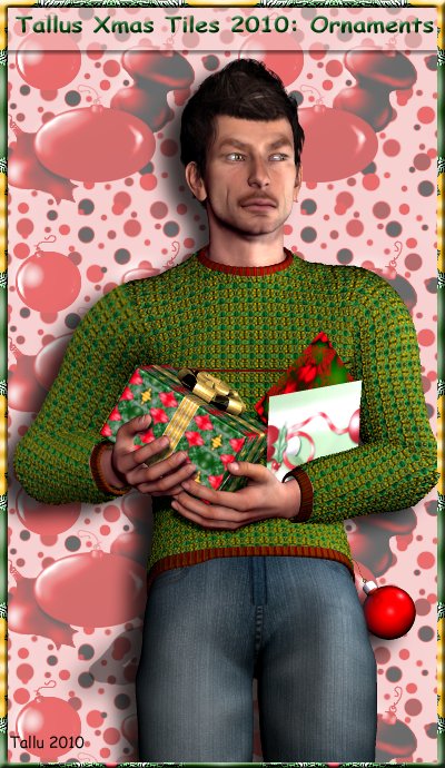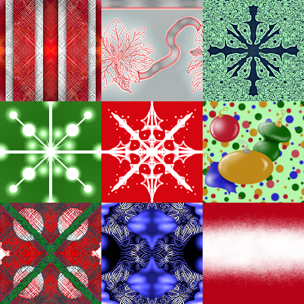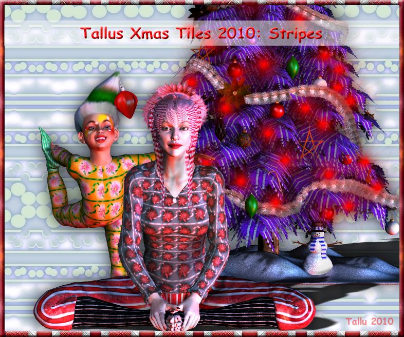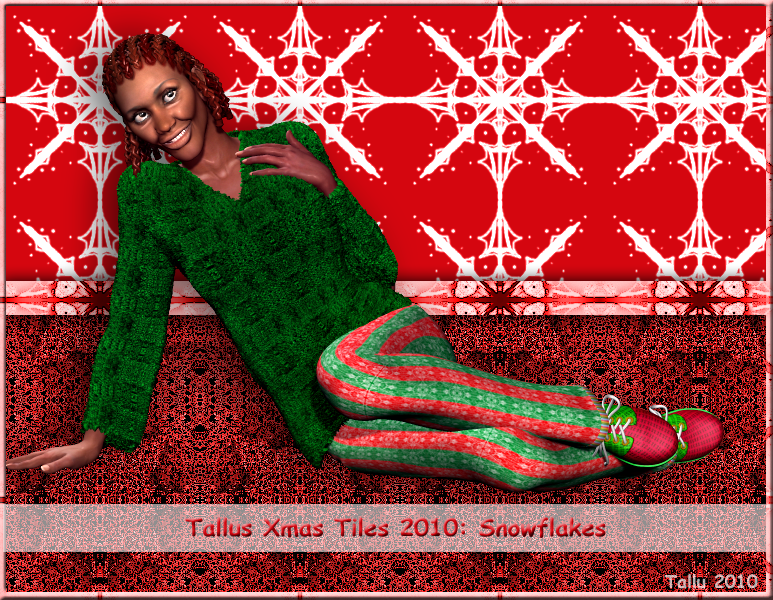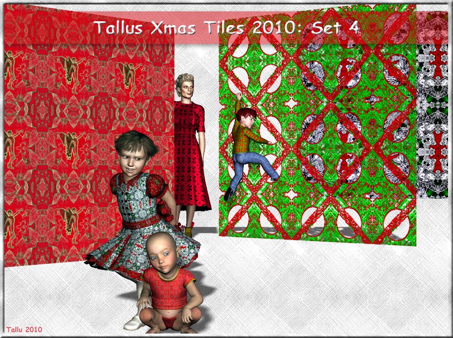 There are 4 ZIP files: And, of course, these tiles are free for personal and commercial renders, and for personal, freebie, and commercial texturing. Terms and conditions ![]() Just a small sample of colored tiles from all 4 sets. ![]() Just a small sample of greyscale tiles from all 4 sets. Think how bumpy and displacementy you can get with these! ![]() From Set #1: Stripey goodness! Greta and Boshenka and their snowman think stripes are the freakin' wave of the future. Poinsettia stripes! Snowy stripes! Bouncy dotty stripes! Nifty gifty stripes! ![]() From Set #2: Snowflakes. There are way more patterns in this set than you see here. The knit texture may not look extremely snowflake-like, but it was derived from a snowflake texture, and comes in greyscale as well as in colors. Tabitha just loves her green sweater and her red and green snowflake patterned pants. Hah! Not all the stripes are in the Stripes zip! ![]() From Set #3: Ornaments! And who would have thought that you could knit a sweater out of ornaments, eh? Well, that's what Hedrick did. You may not be able to tell from here, but his sweater is 100% ornament-derived. It's Christmas magic, I tell you! ![]() From Set #4: Christmas Fairies, Lacy butterflies-and-flowers, and a big X that makes a nice harlequin trellis when you use one of its greyscale versions as a trans map! Great for climbing. Better than a rock wall! ![]() It's possible to go overboard with greyscale. ![]() Mix the tiles up together in one room, and you can have a very Christmassy experience. I think this mature, sophisticated version of Boshenka is going to have a very romantic Christmas. I wonder who's just entered the room, beyond the frame where we can't see? I have a feeling he's worth looking at. Have lots of fun playing with your tiles! Here they are: MERRY CHRISTMAS! Love, Tallulahdahling |