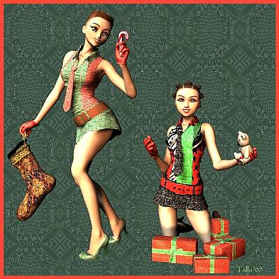 separate MATs, so that they can all be interchanged! All textures, including the bump maps, are hand drawn by Tallulahdahling, so there are no worries about treading on fabric pattern copyrights. These textures are cheery and perfect for holiday renders, but they also will work well (except perhaps the screamingly red and green blouse) at any other time of year. You may object that "Cool Fever" is a little *too* cool to be worn in a winter wonderland, but I live in Australia. So there! Besides,