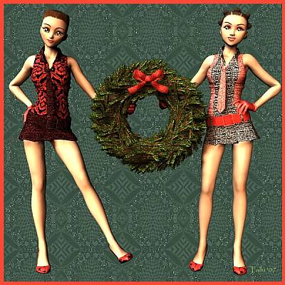 Previews![]() Merry and Cheery red and black! The Aiko sisters want this wreath hung up high, but they're hoping someone will do it for them. Why? Their newly textured holiday outfits did not come with underwear! (The wreath and its textures are not included. They're from DAZ.http://www.daz3d.com, Redhouse Christmas Carol Expansions 1 and 2. Aiko and her textures are also found at DAZ.) ![]() Merry and Cheery red and green! The Aiko sisters are