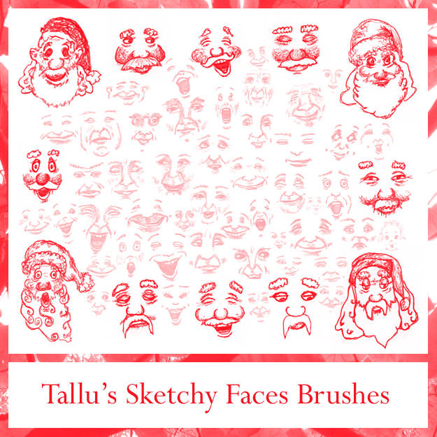 | About Tallu's Sketchy Faces Brushes These 96 brushes are .abr files created in Photoshop Elements 7. I know they also work in Gimp 2.4. I believe they should work in any 2-D program that uses .abr files. If you find that they work in older versions of these, or other programs, please let me know. I'm an obsessive doodler, usually making faces with various expressions as I talk on the phone or listen to a lecture. Yes! I can concentrate on a lecture perfectly well while doodling, although my husband is skeptical of that. I decided I'd like to have brushes of some of these doodles so that I can easily make clip-art in various colors and sizes for my e-mails. After I had a good-sized brush collection, I decided to offer them as a freebie to anyone who can find of a use for them. There are 15 Santa faces included among these 96 faces. I hope you'll have fun finding ways to use these. I certainly had fun doodling them! Merry Christmas! Tallulahdahling TERMS OF USE: These brushes are free for use in both personal and commercial art, no credit necessary. Where do they go? In PHOTOSHOP they go in Presets/Brushes. In GIMP they go in Share/gimp/2.0/Brushes You'll have to navigate to the right place. The .zip won't automatically put them in the right place. CONTACT: barboo (at) prodigy.net Or Private Message me in the DAZ forum. |